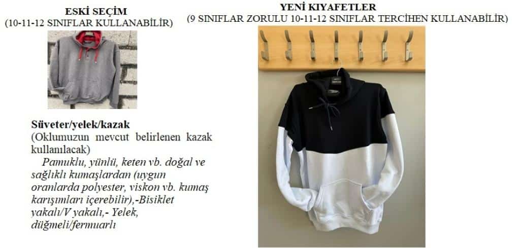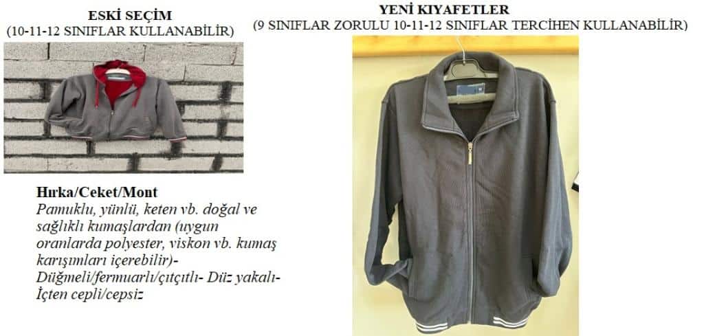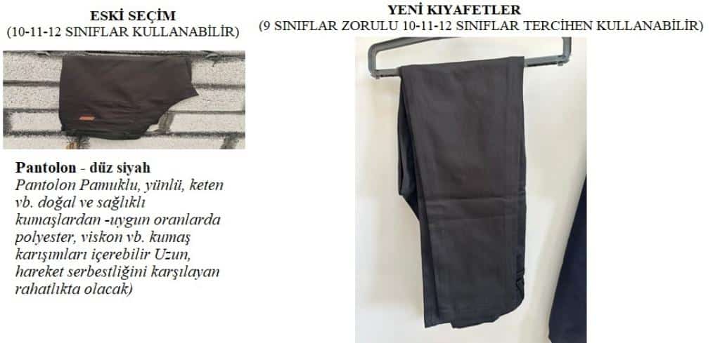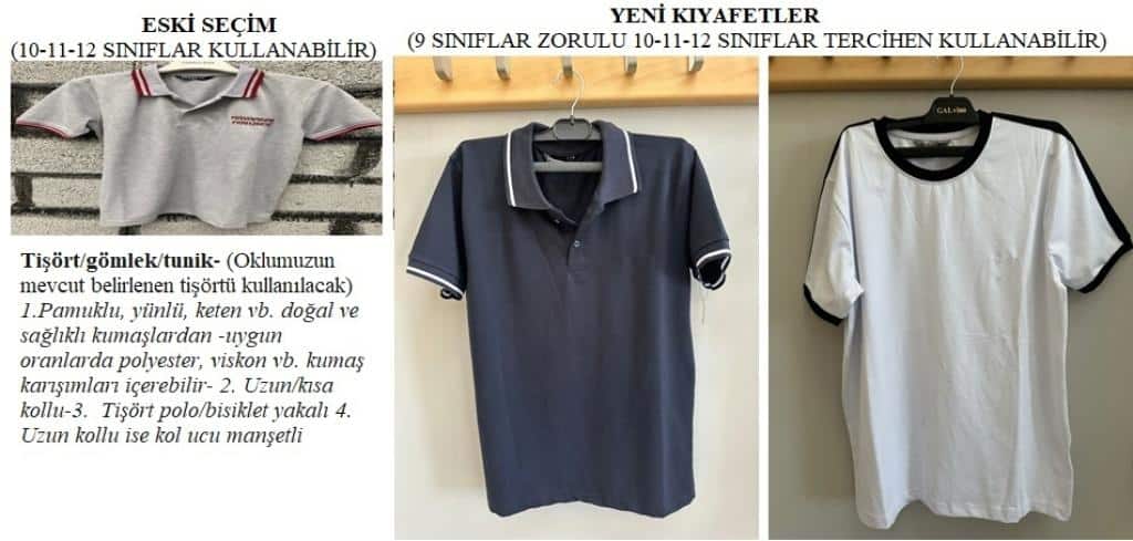 Okulumuz da uygulanan kıyafetler: 10. 11. ve 12. sınıf öğrencilerimiz aşağida belirtilen kiyafetlerini mezun oluncaya kadar giymeye devam edebiliriler. 9. sınıflarımız ise yeni belirlenen okul kıyafetlerini giyeceklerdir .